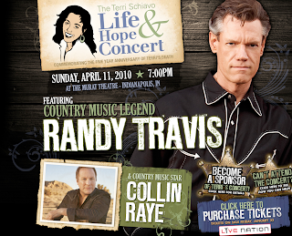 The Terri Schindler Schiavo Foundation is hosting the Life and Hope Concert on Sunday, April 11th, 2010 at the Murat Theatre in Indianapolis, IN. Did I mention that Randy Travis will be performing? AND Collin Raye? Two incredibly talented musicians with hearts of gold and totally devoted to defending the sanctity Life. Seriously, this is not to be missed if you can swing it.